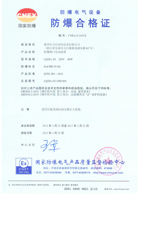 熱烈祝賀合力LQ系列防爆執(zhí)行機(jī)構(gòu)取得國(guó)家防爆證書